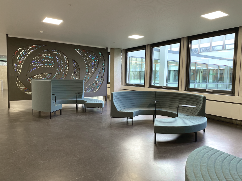Form und Material ergänzen die Gebäudestruktur aus Sichtbeton, Holz und dunklem Linoleum und interagieren in Form und Farbe mit der Kunst am Bau. Der offene Aufenthaltsbereich ist inzwischen beliebter Treffpunkt.