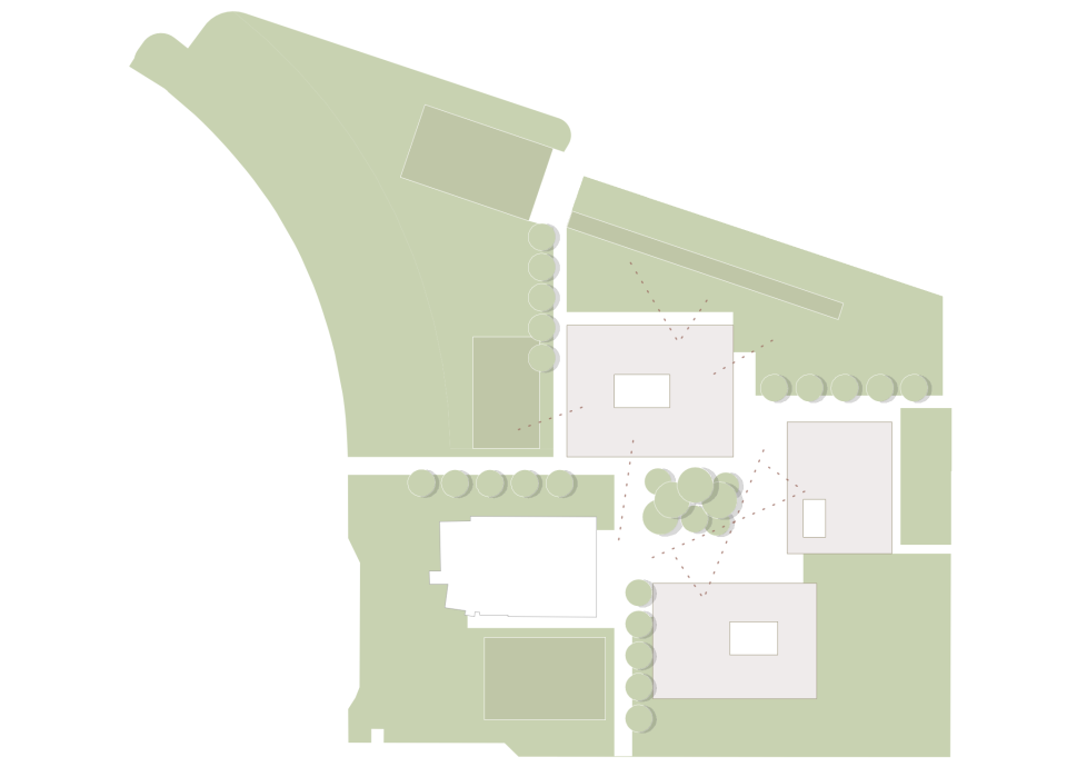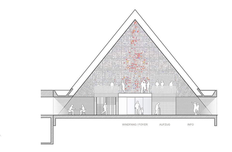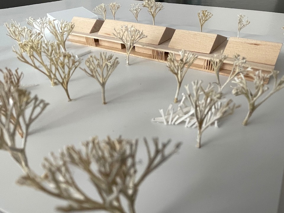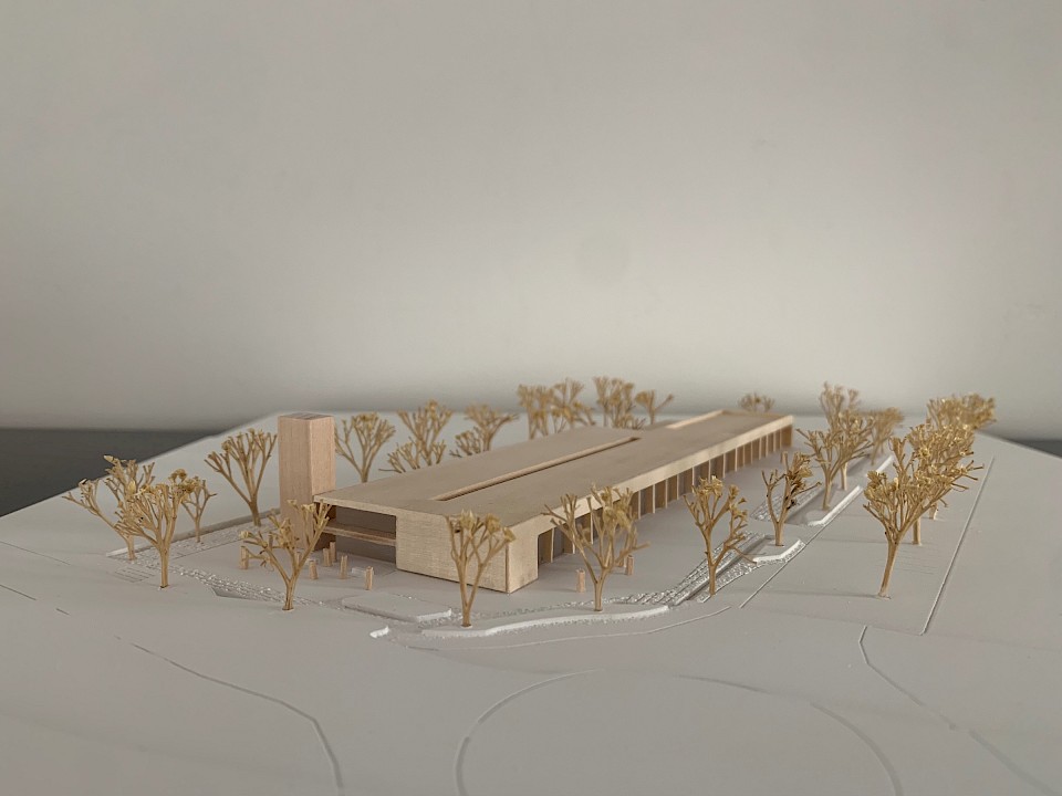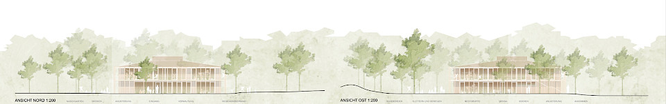 Als landschaftsbezogene Kuben werden die neu geplanten Gebäude in die grüne Talaue gebettet. Das Bild des Bretterstapels dient als Leitgedanke für Form, Anmutung und Positionierung des Entwurfes. Die Elemente des Bretterstapels »Brett« und »Kantholz« werden für die Hülle eingesetzt um gezielt Lichteinfall, Ein- und Ausblicke, offene und geschlossene Wandelemente zu bilden.