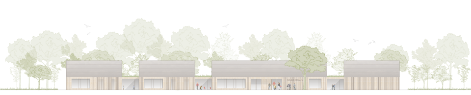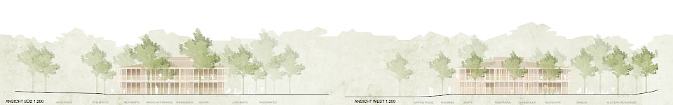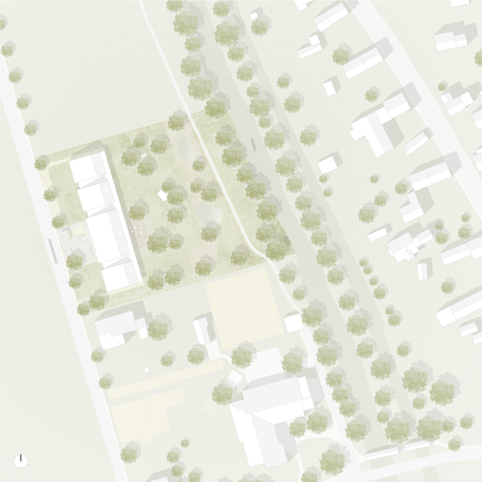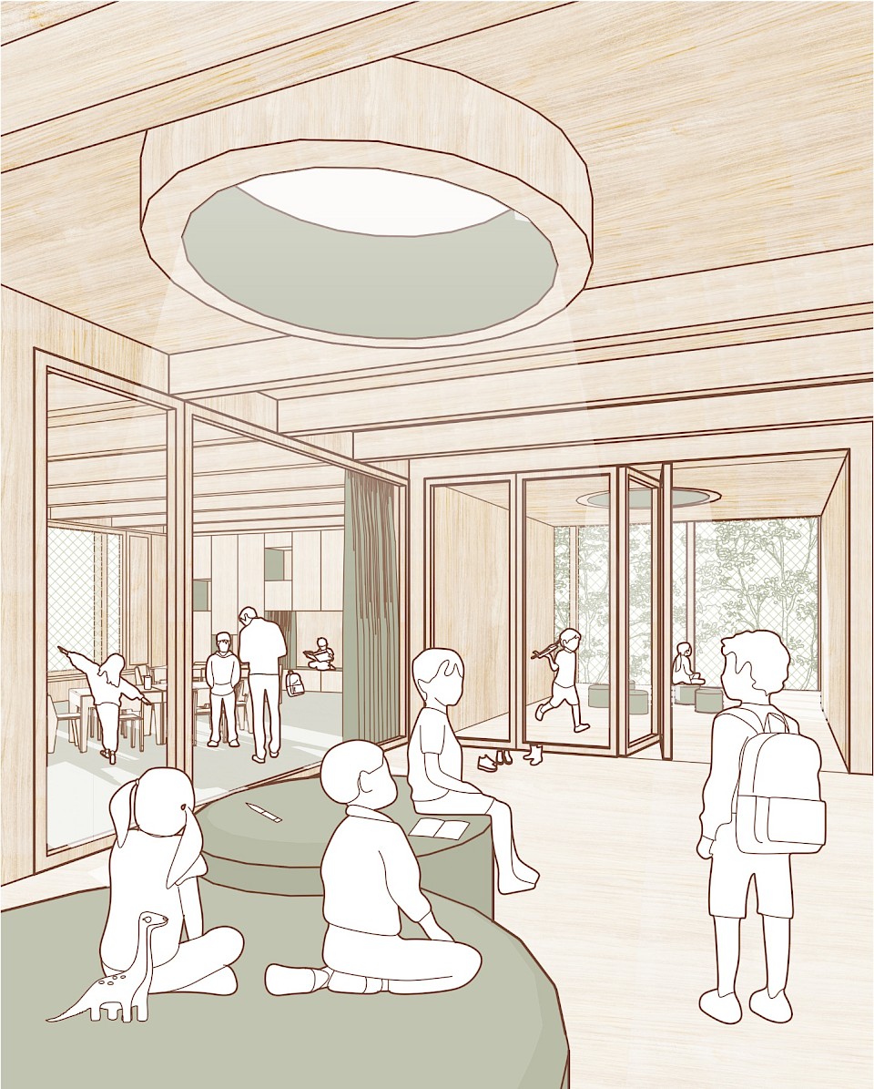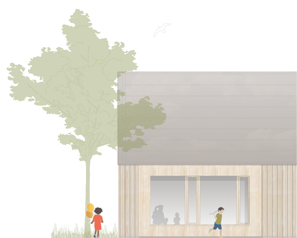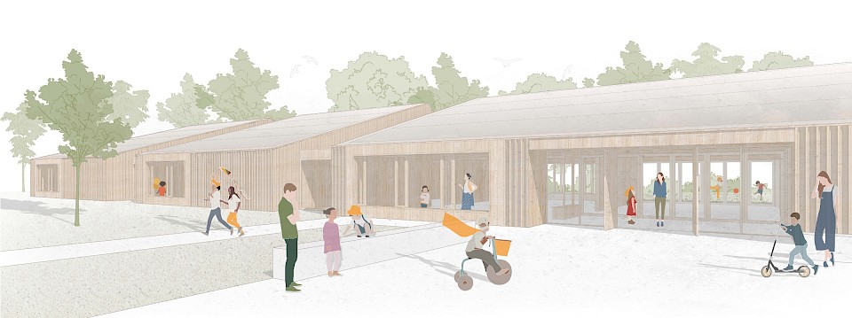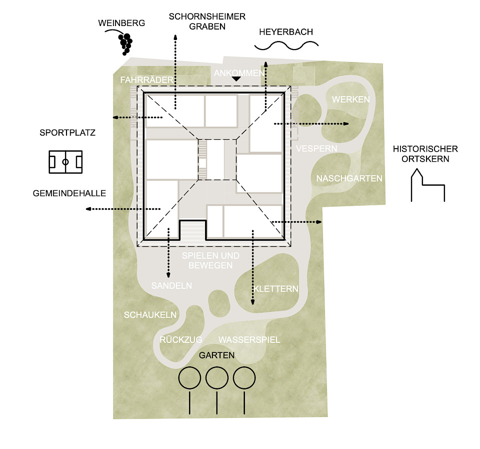 Die ursprüngliche Einfassung des Ortes mit Mauern wird als Thema aufgenommen und bildet einen schützenden Rahmen für das gesamte Grundstück, für Gebäude und Außenräume. Die räumliche Einbindung von bestehenden Wegebeziehungen ermöglicht den Zugang von zwei Seiten und nutzt die gesamte Grundstücksfläche als Freispiel- und Außenfläche. Der Zugang erfolgt auf der Nordseite über eine einladende Eingangsüberdachung und das großzügige, zentral liegende Foyer und bietet direkten Ausblick in den südlich vorgelagerten Außenspiel-bereich. Der einfache Baukörper gliedert sich in offene und geschlossene, in höhere und niedere Zonen. Die Gemeinschafts- und Gruppenräume öffnen sich nach Süden, sind zum Außenspielbereich hin orientiert. Das lange Dach überspannt alle Bauteile und verbindet zusammen mit den vorgelagerten Holzrosten Innen- und Außenraum.