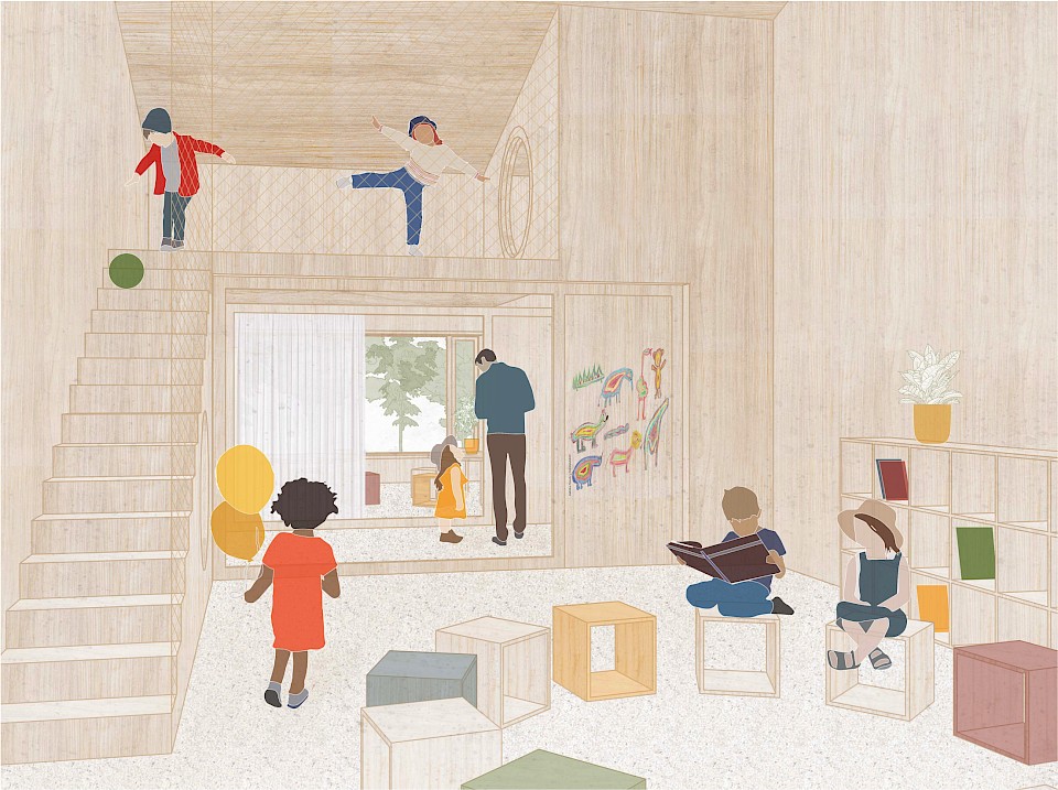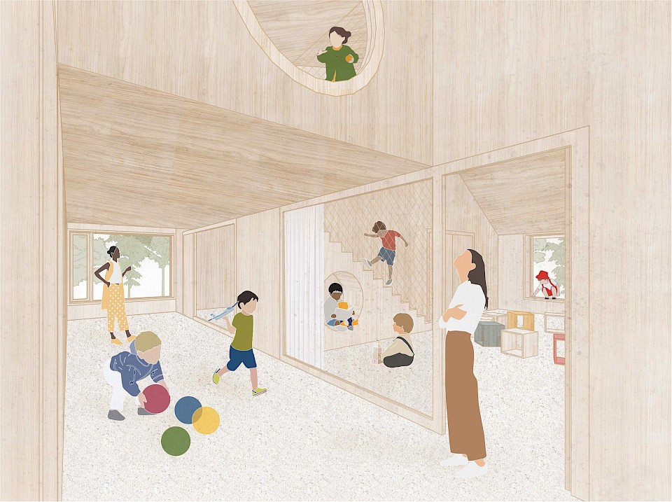 Die Dachform schafft in den Gruppenräumen eine zusätzliche Spielebene über dem Spielflur, die zusammen mit Treppe und Nischen vielfältige Spiel- und Rückzugsmöglichkeiten bietet. Es entsteht eine hohe räumliche Qualität durch differenzierte Raumhöhen, Blickbeziehungen und Raumfolgen.