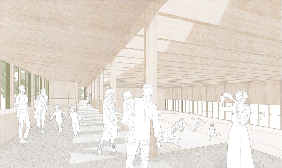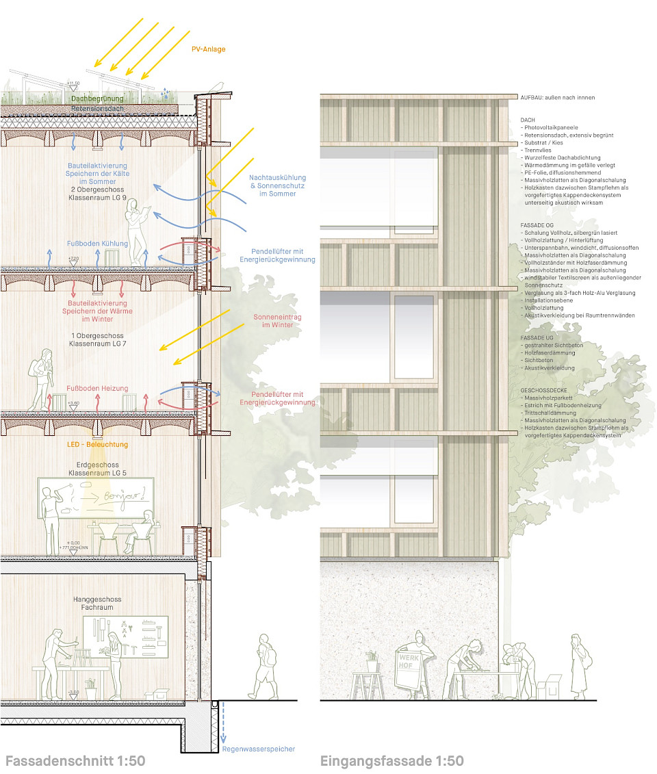 Konstruktiv setzt das Projekt auf einen ressourceneffizienten Holzbau mit vorgefertigten Elementen. Die Dachträger bleiben sichtbar und bieten Platz für Technik und Belichtung. Robuste, langlebige Materialien sorgen für eine nachhaltige, wirtschaftliche Bauweise. Das Energiekonzept umfasst Photovoltaik, natürliche Lüftung und Anschluss an das Nahwärmenetz.