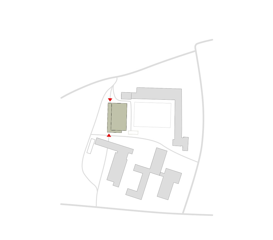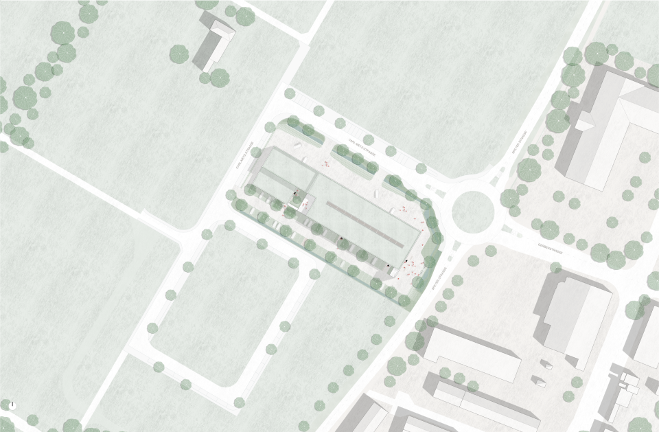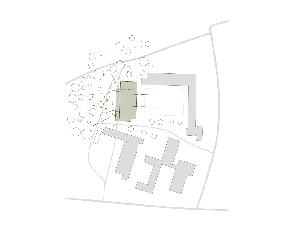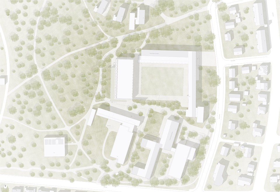 Die neue Sporthalle wird als verbindendes Element zwischen Stadtwald und Schulcampus in die bestehende Topographie und Gebäudestruktur integriert. Mit klarer Formensprache, einem einladenden Eingangsbereich und durchdachten Blickachsen entsteht ein zentraler Treffpunkt für Schule, Sport und Vereine. Der Baukörper gliedert sich funktional in zwei Ebenen und passt sich dem Gelände an. Alle Wegebeziehungen werden aufgenommen und fortgeführt, wodurch die Halle optimal erschlossen ist.