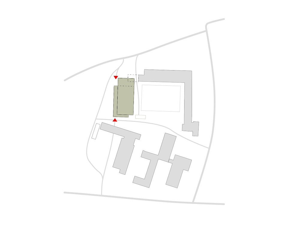 Zwei Neubauten ersetzen die baufälligen Gebäude und bilden zusammen mit der Sporthalle und dem bestehenden Unterrichtsgebäude ein Ensemble. Sie stärken den maßstäblichen Charakter der Gesamtanlage und rahmen die gegenüberliegende markante Kreuzbergkirche.