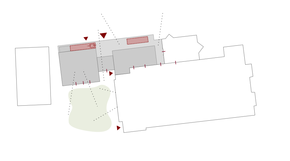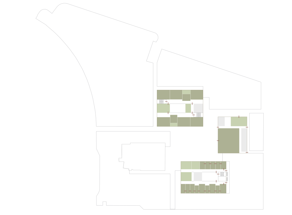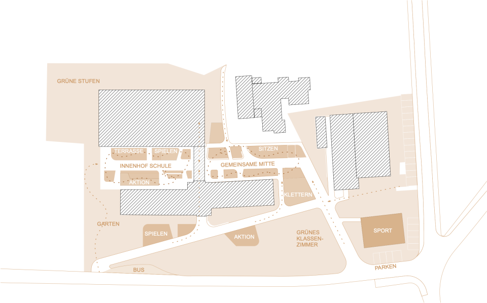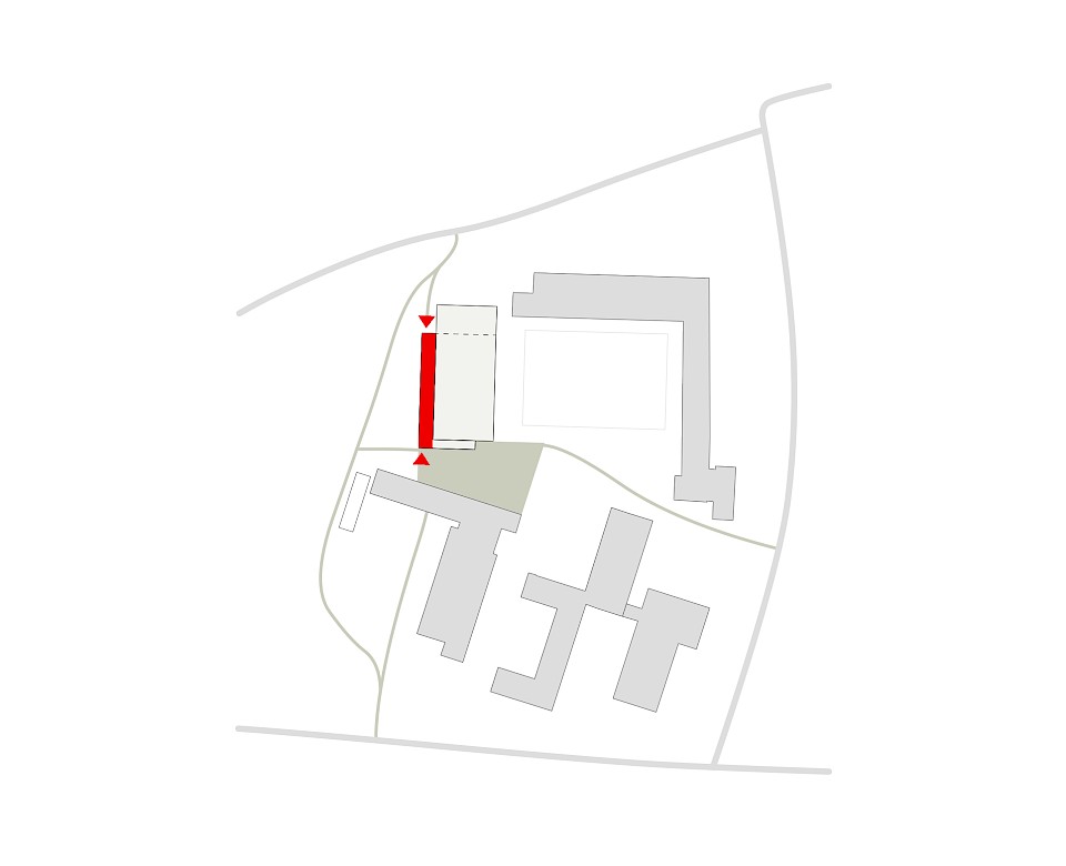 Der Neubau für Allgemeinen Unterricht und Verwaltung bildet den Nordflügel der Schulanla-ge mit Förderschwerpunkt emotionale und soziale Entwicklung. Der Neubau der Fachräume erweitert das bestehende Unterrichtsgebäude und fasst so die Fachklassenbereiche in einem neu entstehenden Südflügel zusammen. Dazwischen entsteht ein geschützter Schulhof. Ent-sprechend der vorhandenen Topographie entwickelt sich am Kopfende des Neubaus ein Hanggeschoss. Dort liegen Mensa und Mehrzweckraum mit vorgelagerter Terrasse und schönem Blick zur Kreuzbergkirche. Die attraktive Lage ermöglicht vielfältige Nutzungen für den Schulbetrieb sowie für außerschulische Veranstaltungen nahe dem Kirchplatz.