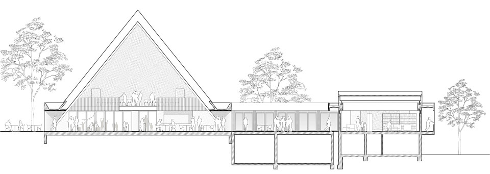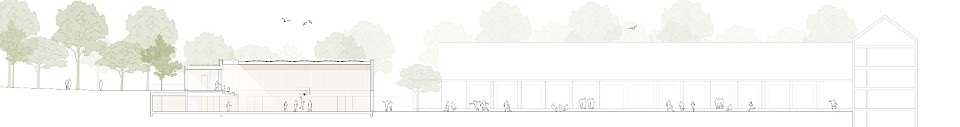 Die Freianlagen erhalten den Baumbestand und binden die Halle sensibel in den Stadtpark ein. Gründächer und Regenrückhaltung fördern die Nachhaltigkeit. Die geplante Erweiterung der Turnhalle im Norden folgt dem gleichen Konzept und kann ohne Betriebsunterbrechung realisiert werden.