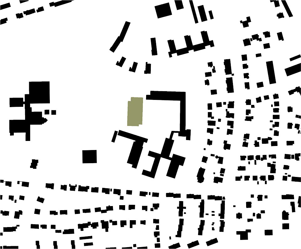 Ebenerdig liegen die von Hof- zu Gartenseite durchgesteclkte Aula mit Bücherei und Nebenräumen sowie im Hof Fahrradraum und Werkstatt. In den oberen 3 Geschossen liegen gartenseitig helle, funktional optimierte Wohn- und Schlafräume mit gemeinschaftlichen Aufenthaltsbereichen Richtung Hof.