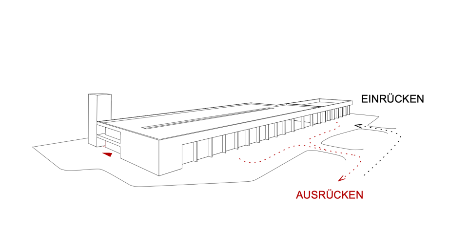 Der Entwurf des Hilfeleistungszentrums in Edingen-Neckarhausen vereint Funktionalität, Effizienz und Nachhaltigkeit in einer kompakten, klar gegliederten Architektur. Der Baukörper ist entlang einer Ost-West-Achse organisiert mit Fahrzeughalle, Versorgungs- und Gemeinschaftsbereichen sowie adressbildendem Turm und Vorplatz zur Speyerer Straße. Die Konstruktion als vorgefertigter Holzbau mit Betonstützen ermöglicht eine schnelle, wirtschaftliche Umsetzung und schafft eine helle, freundliche Atmosphäre im Inneren. Die Freianlagen sind ökologisch und funktional gestaltet, mit einem begrünten Rahmen, versickerungsfähigen Belägen und multifunktionalen Flächen wie Alarm- und Übungshof.
