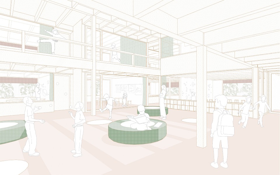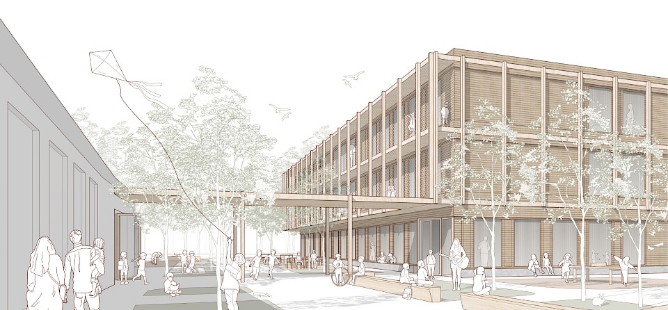 Die Grundschule Kirchheide wird durch Sanierung und Erweiterung modernisiert, um den Ortskern zu stärken und die vorhandene Topografie sowie den Baumbestand für vielseitige Freiräume zu nutzen. Neubau, Bestand, KiTa und Sporthalle bilden ein Ensemble entlang einer barrierefreien Campusachse mit hoher Aufenthaltsqualität. Der Neubau integriert Mensa, Musikraum und Bibliothek flexibel nutzbar für Schule und Gemeinde, die oberen Etagen enthalten Cluster mit Klassen, OGS-Bereichen und Lerninseln. Der Altbau bleibt weitgehend erhalten und wird barrierefrei erschlossen. Nachhaltigkeit zeigt sich in Holz-Hybridbauweise, energieeffizienter Technik und recycelbaren Materialien. Der Bau erfolgt in Etappen mit einem temporären Schulquartier.