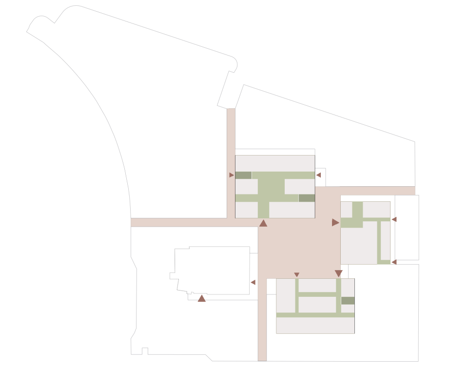 Der Spielflur weitet sich im Bereich der lichtdurchfluteten Zwischenzonen und verbindet Innen- und Aussenräume. Allen Gruppenräumen ist eine überdachte Terrasse vorgelagert und erweitert sie so mit einem geschützten Aussenbereich zum Grünraum ins Freie. Durch Vor- und Rücksprünge entstehen abwechslungsreiche Innen- und Aussenräume mit Loggien und Gartenlauben.