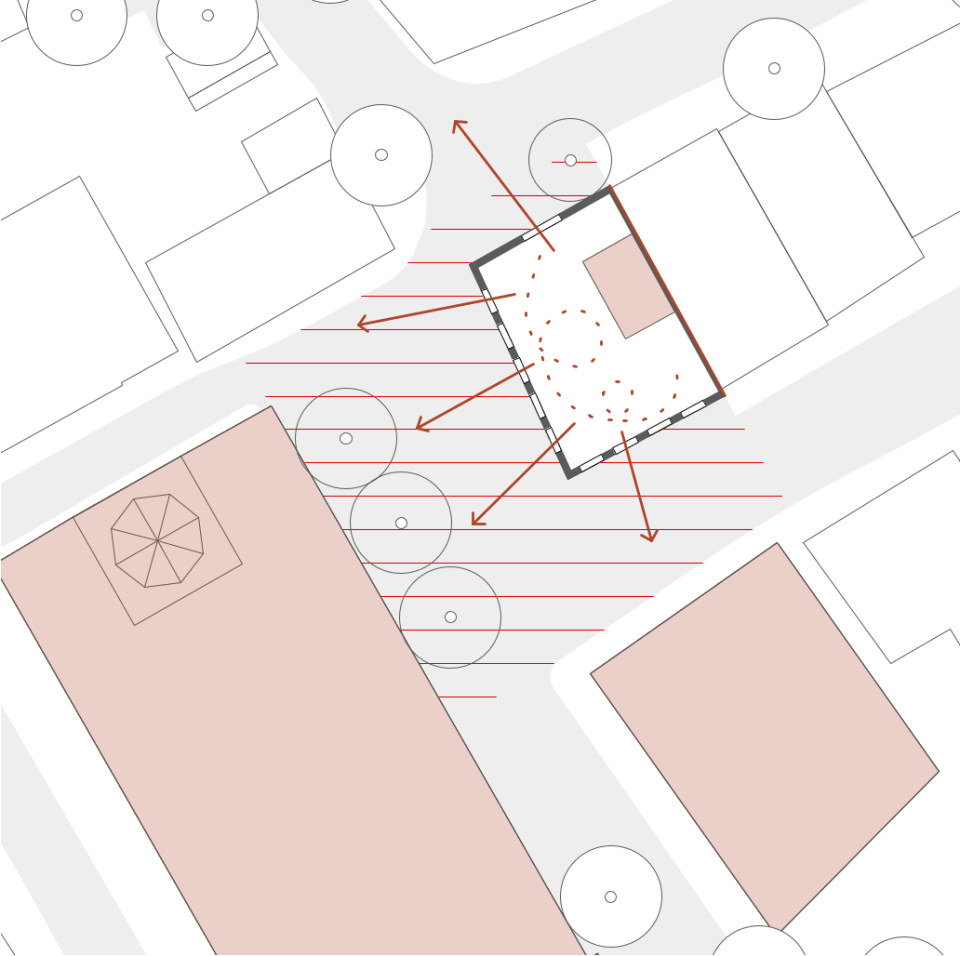 Das Grundstück liegt mitten im Ortskern. Der großzügig verglaste Blumenladen öffnet sich zu Kirche, Straßenraum und Innenhof, der die Ausstellungs- und Verkaufsfläche erweitert und zum Verweilen einlädt. Der schmale Blumen-Binde-Raum verbindet Haupt- und Nebenge-bäude und trennt gleichzeitig gewerblichen von privatem Arbeits- bzw. Lebensbereich.