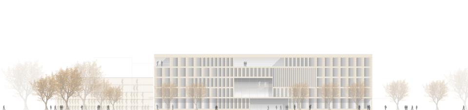 Das neue Rathaus in Greven soll als verbindender Solitär entlang der Rathausstraße die Stadtteile links und rechts der Ems zusammenführen. Es bildet mit Grünraum und Quartiersgarage ein Ensemble, das zentrale Wegebeziehungen aufnimmt und den Stadtraum stärkt. Der Neubau schafft mit drei differenzierten Platzräumen ein attraktives Umfeld für Bürger und Besucher. Die Freianlagen sind funktional gegliedert mit Aufenthaltszonen, einem Wasserspiel, Pocket-Park, Pavillon, Spielskulptur und begrünten Flächen, wobei Lärm abgeschirmt und Raum für Stadtleben geschaffen wird. Im Inneren zeigt sich ein offenes Haus mit flexibel nutzbaren Büro- und Begegnungsflächen, einem durchlässigen Foyer, Bistro, Bibliothek über drei Ebenen und einem lichtdurchfluteten Ratssaal mit Ausblicken in den Stadtraum. Das Tragwerk aus Stahlbeton in Skelettbauweise bietet hohe Flexibilität; die Fassade aus sandgrauem Klinker mit Holz-Alu-Elementen wirkt einladend und hochwertig. Die Quartiersgarage ist als begrünte, rückbaubare Stahlkonstruktion im Sinne des zirkulären Bauens geplant.
