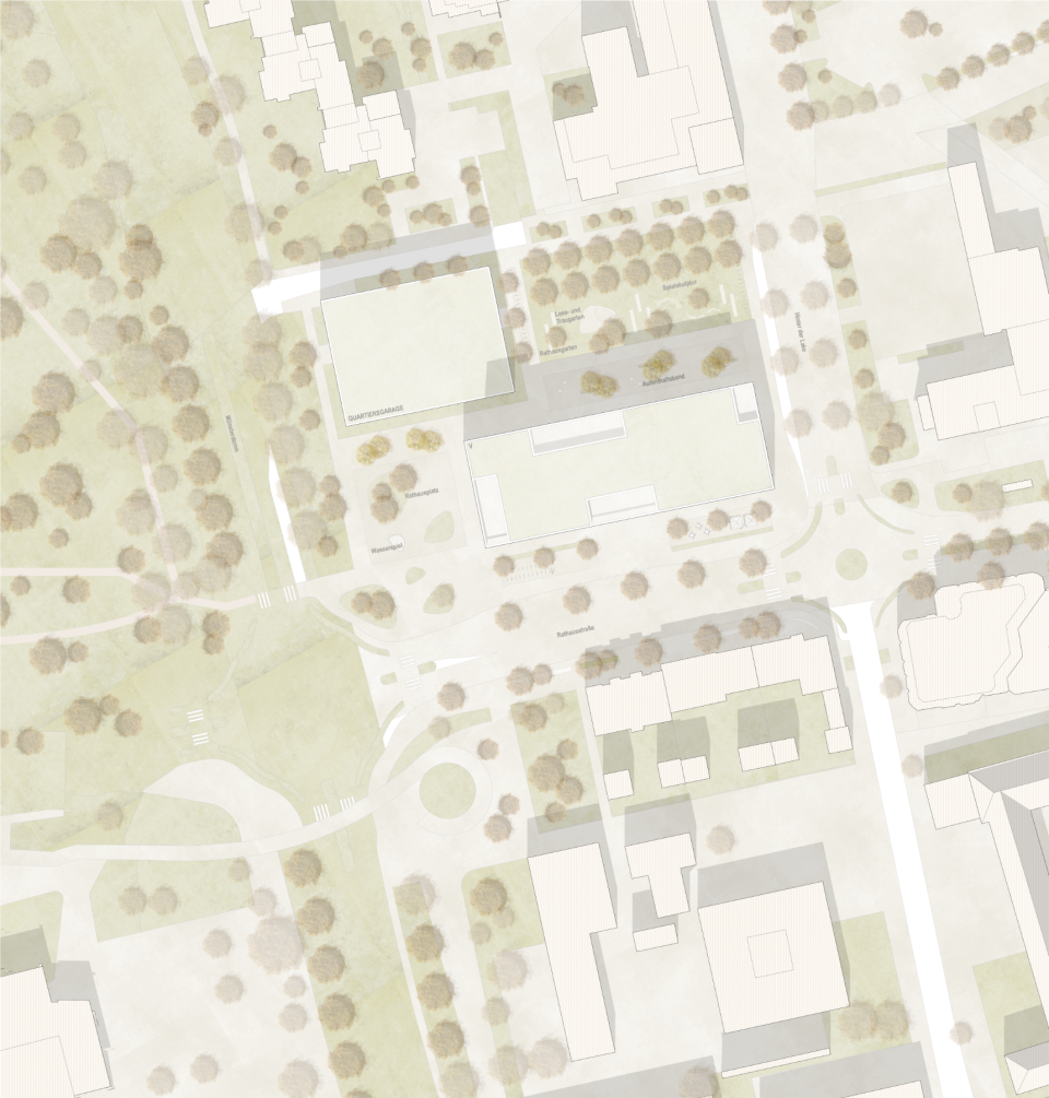 Das neue Rathaus orientiert sich mit den wichtigen Blickbeziehungen in Richtung Kirchplatz, Sprungschanze, und Vinzenz Zahn und formuliert durch die neuen Raumkanten einen markanten Stadtbaustein der den Bestand ergänzt. Zusammen mit den historischen Bauten in der unmittelbaren Umgebung wird ein Gesamtensemble geschaffen. Der einladende Vorplatz direkt gegenüber der Kirchwiese markiert den Eingangsbereich, der mit seinem geschützten Zugang Besucher willkommen heisst. Im vorderen Gebäude befinden die öffentlichen Nutzungen im zurückgesetzten Baukörper die Verwaltungsbereiche.
