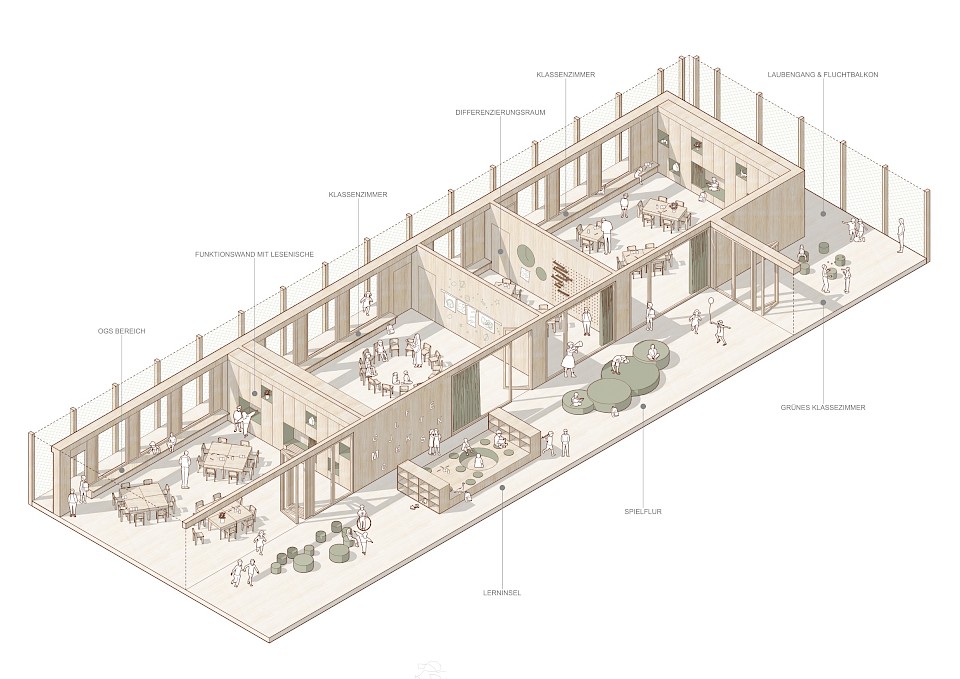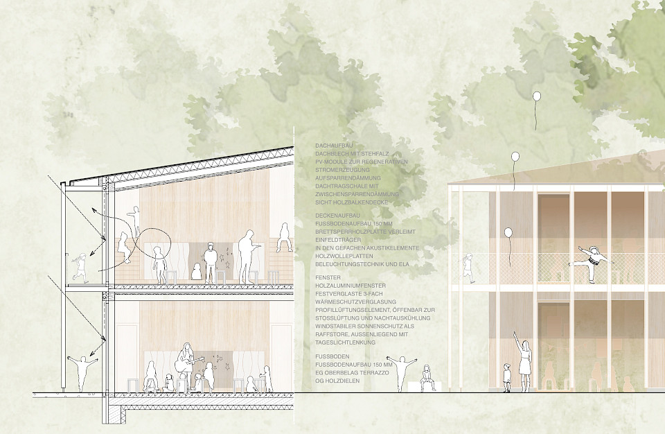 Der Neubau ist als nachhaltiger Holzbau mit hohem Vorfertigungsgrad konzipiert. Materialien wie Weißtanne und RC-Beton, natürliche Lüftung und begrünte Dächer tragen zur ökologischen Bauweise bei. Die Freianlagen bieten vielfältige Spiel-, Lern- und Rückzugsräume – vom grünen Klassenzimmer bis zur Erlebbarkeit des Mühlkanals. Das Energiekonzept orientiert sich an DGNB-Kriterien und unterstützt zirkuläres Bauen. Brandschutz und Rettungswege sind funktional und flexibel integriert.