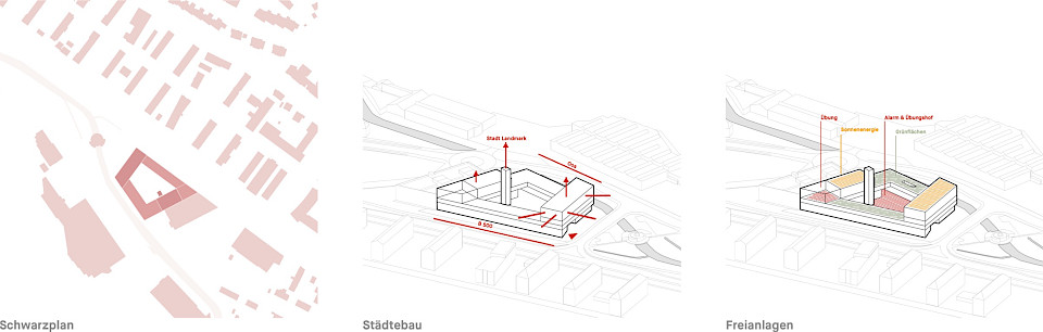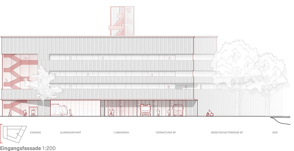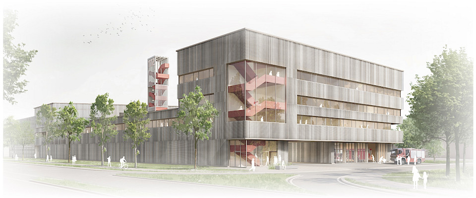 Die neue Feuerwache bildet als markanter Auftakt am Stadteingang ein identitätsstiftendes Element des Quartiers. Der klar strukturierte Gebäudekomplex orientiert sich an den funktionalen Anforderungen und gruppiert vier Gebäudeflügel um einen geschützten Innenhof. Ein prägnanter Kopfbau mit Turm dient als weithin sichtbare Landmarke. Die verkehrliche Erschließung ermöglicht schnelle Alarm- und Rückfahrtswege; separate Zugänge bestehen für Berufs- und Freiwillige Feuerwehr.