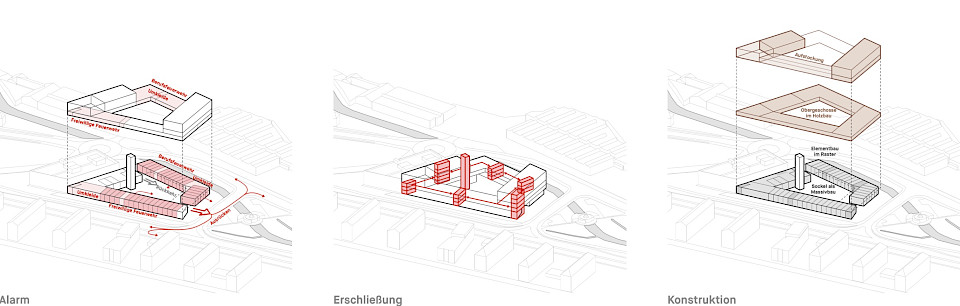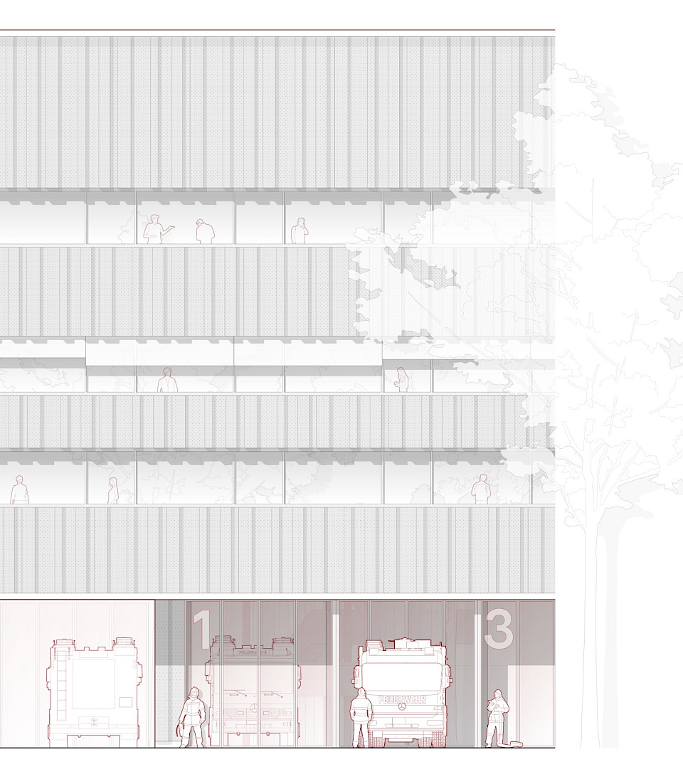Konstruktiv ist das Gebäude als nachhaltige Holz-Beton-Hybridkonstruktion konzipiert: massive Untergeschosse, robuste Erdgeschossbereiche für Fahrzeughallen und darüber leichte Holzgeschosse. Langlebige Materialien, hohe Vorfertigung und eine profilierte Metallfassade mit roten Akzenten prägen das Erscheinungsbild.