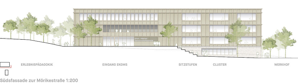 Die Schule, die unser Büro bereits mehrmals für Neu- und Erweiterungsbauten beauftragt hat, wird um einen Trakt für Fachklassen erweitert. Es entstehen acht helle und freundliche Unterrichtsräume die als Werkstätten, Lehrküche und Raum für Textiles Werken dienen. Sie werden von den Grund-, Werkreal- und Realschülern gemeinsam genutzt und von der bestehenden Erschließungsachse her zentral erschlossen. Großzügige Verglasungen sorgen für ausreichend Tageslicht und einen freien Blick ins Grüne. Zusammen mit dem neu verglasten Flur, der Sporthalle, dem Werkhof und dem schönen Grünraum mit Baumbestand entsteht ein neuer einladender Ort für die gesamte Schule.