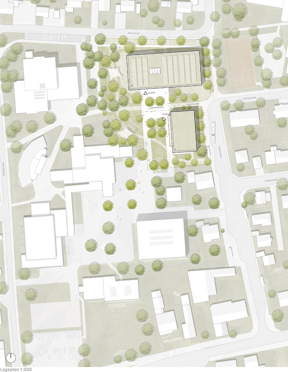 Die neue Gemeinschaftsschule integriert sich sensibel in die Topographie und bildet zusammen mit der Mensa und dem zentralen Campusplatz einen grünen, identitätsstiftenden Campus. Klare Baukörper rahmen das Gelände, schaffen differenzierte Freiräume und stärken die Wegebeziehungen. Großzügige, organisch gestaltete Grünflächen verbinden Schule und Mensa und bieten Zonen für Bewegung, Rückzug und Begegnung. Ein Erlebnisband mit pädagogischen, ruhigen und sportlichen Bereichen ergänzt das Freiraumkonzept. Nachhaltige Regenwasserbewirtschaftung, Barrierefreiheit und eine klare Erschließung sind selbstverständlich integriert.