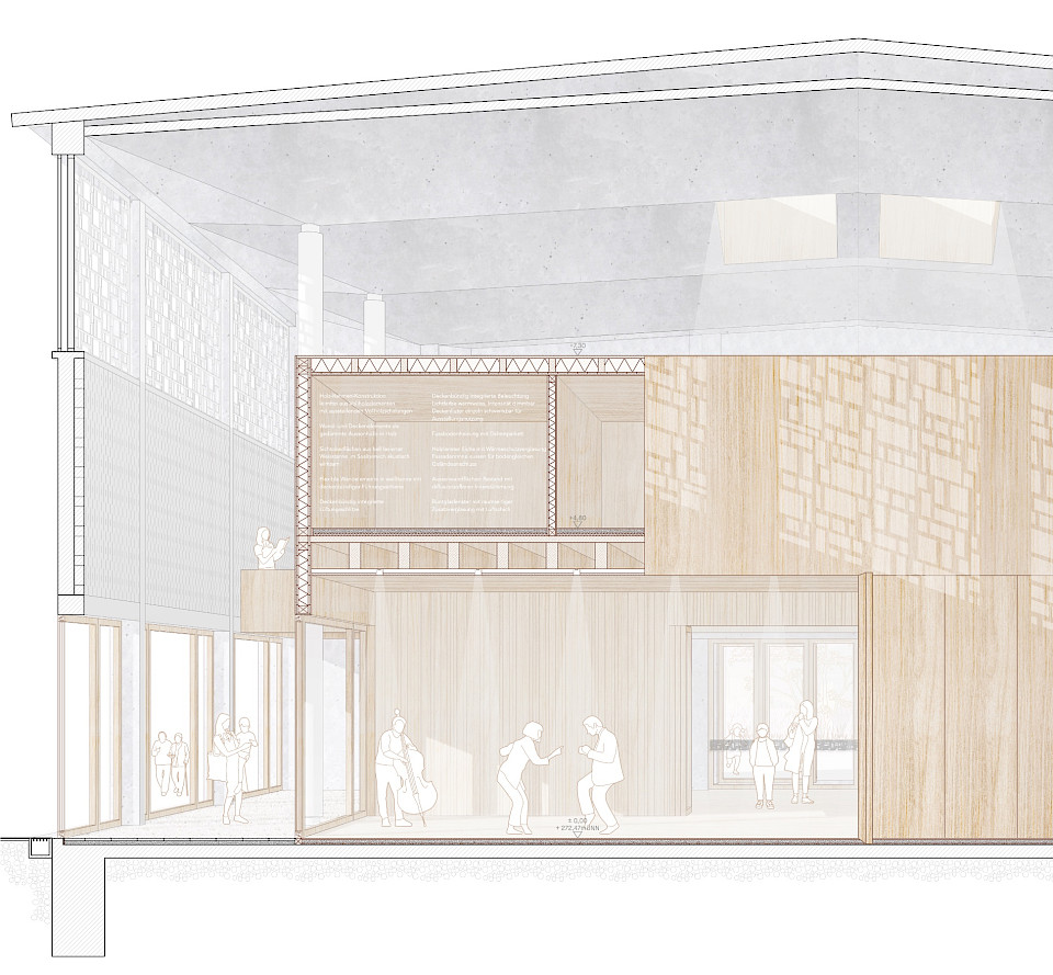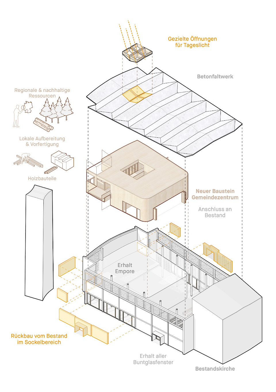 Kern des Entwurfs ist ein zweigeschossiges „Haus-im-Haus“-Konzept aus Holz, das freistehend in den bestehenden Kirchenraum eingefügt wird. Es bildet das neue lebendige Zentrum mit Gemeindesaal, Büros, Jugendräumen und Nebenräumen. Der Kirchenraum mit Chor bleibt – leicht verkleinert – als geschützter Gottesdienstraum erhalten. Flexible, verschiebbare Wandelemente ermöglichen variable Nutzungen und eine Öffnung zum Kirchenraum für größere Veranstaltungen.