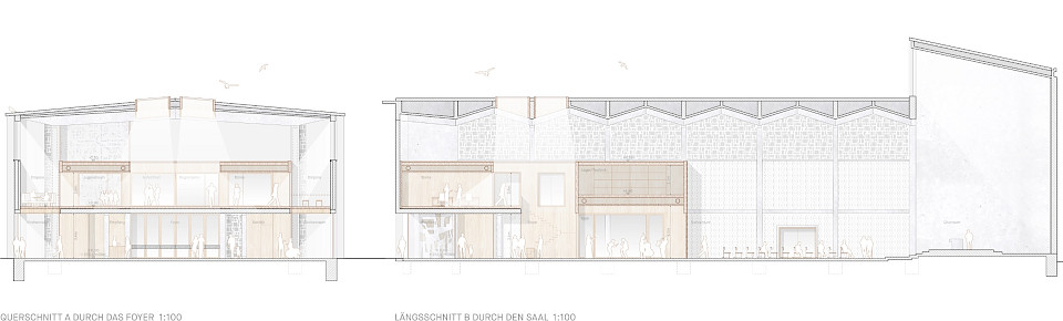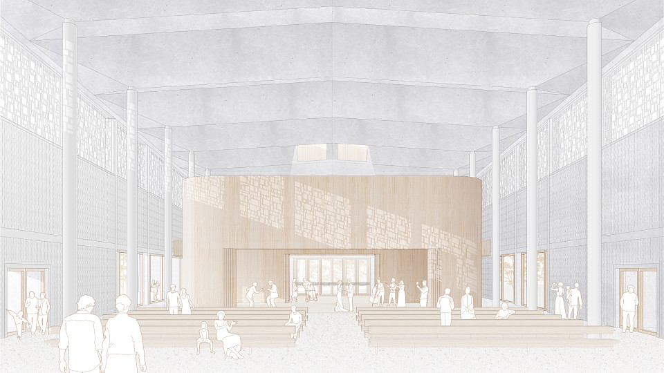 Die ehemalige Kirche wird zum zentralen Gemeindehaus umgestaltet, ohne ihre architektonische Identität zu verlieren. Durch gezielte, reversible Eingriffe im „Haus-im-Haus“-Prinzip entstehen flexible, barrierefreie Nutzungsbereiche für Veranstaltungen unterschiedlicher Größe. Das große Kirchenvolumen wird durch zusätzliche Ebenen funktional ergänzt, bleibt jedoch in seiner räumlichen Wirkung erhalten.