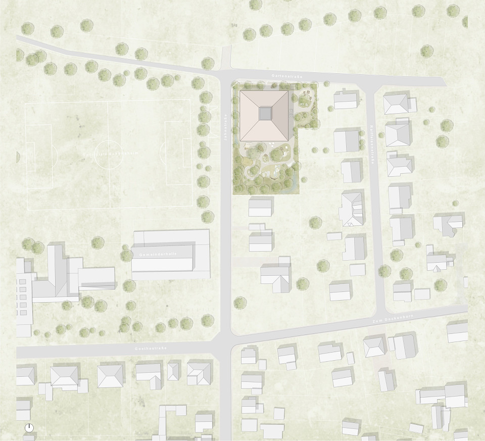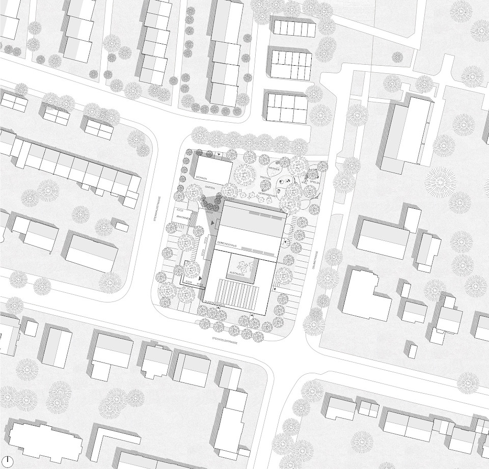 Der Freiraum wird geöffnet und stärker in das Quartier eingebunden. Ein einladender Vorplatz, barrierefreie Erschließung und flexible Raumstrukturen fördern die Verbindung zwischen Innen- und Außenraum. Insgesamt entsteht ein identitätsstiftendes, offenes Gemeinde- und Quartierszentrum mit zukunftsorientierter, nachhaltiger Ausrichtung.