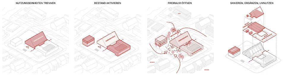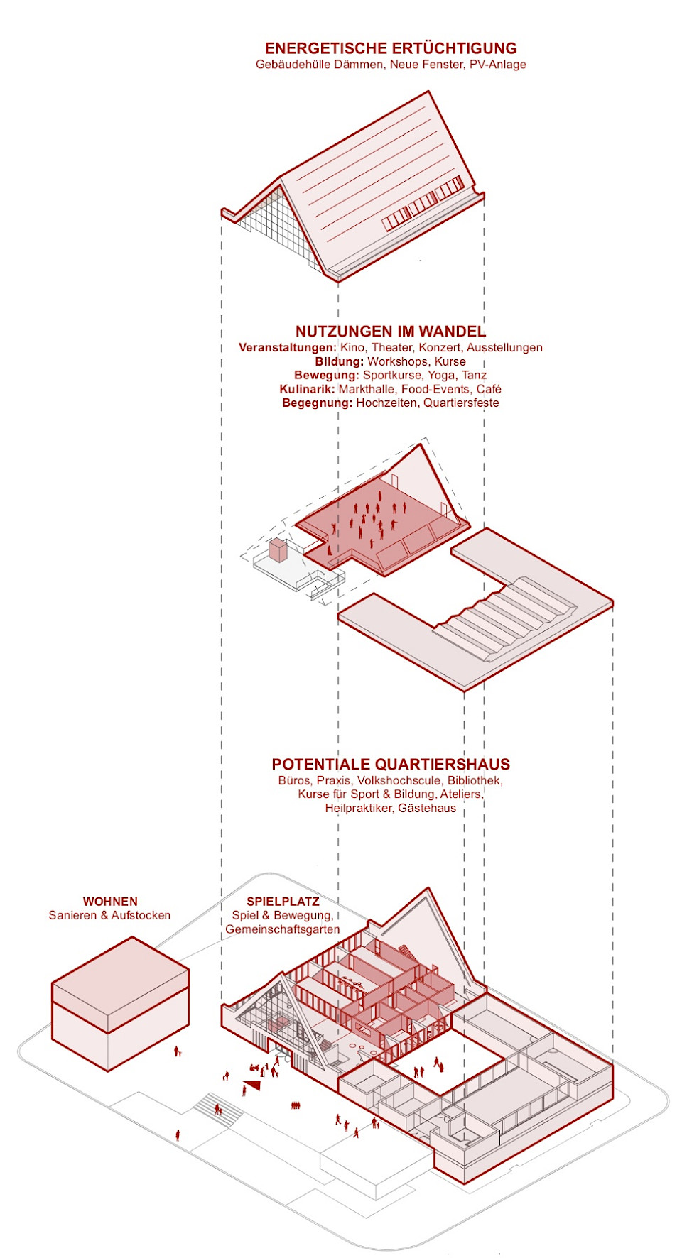 Das Projekt sieht die behutsame Umnutzung des Ensembles aus Kirche, Gemeindezentrum und Pfarrhaus vor, um einen langfristig tragfähigen Ort für Gemeinde und Öffentlichkeit zu schaffen. In einem flexiblen, mehrphasigen Entwicklungsprozess entstehen offene, klimabewusste und generationsübergreifende Räume für Begegnung, Lernen, Kultur und Austausch.
